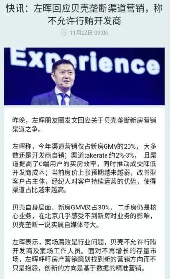 对此,链家兼贝壳找房董事长左晖朋友圈发文回应,近年途径营销仅占新房GMV的20%,大多数仍是开发商自销;在贝壳本身层面,新房GMV仅占30%,二手房仍是中心事务。