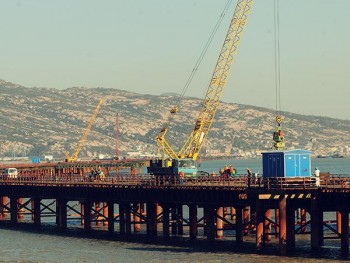 在土木工程施工中,特别是水上桥梁施工时,为满足施工人员机械设备的交通、材料的运输、施工管道的铺设等要求而修建的临时通道,栈桥一般设置在下游侧以减少水流冲刷的影响。