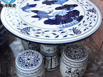 r(盛夏之夜,一家人在阳台、庭院中,围坐在陶瓷桌旁,喝茶赏月,其乐融融…….)景德镇陶瓷桌子(凳子):高温烧制的陶瓷桌子、凳子为景德镇特有,它可以放在室外或者阳台,不怕日晒雨淋,不会产生类似破损或者变型等问题,陶瓷桌面、凳子的画面是手工绘画的,艺术感非常强。同时我们工厂可以单独绘制客户喜爱的画面,或者赠送题字等,具有非常纪念意义!